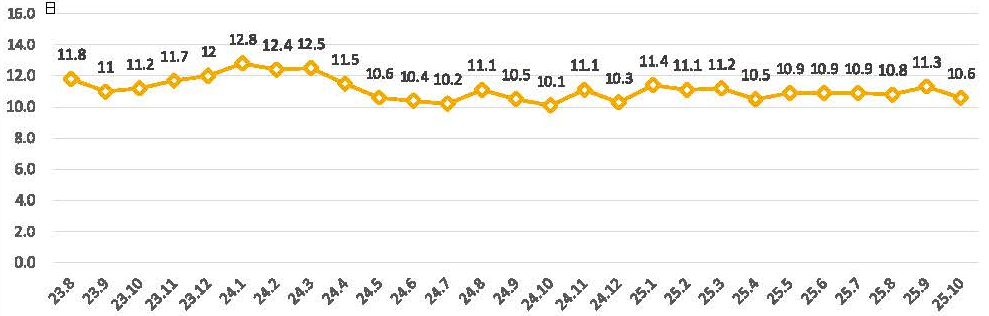 入院された患者さまが、平均何日後に退院されたかを月平均で表したグラフです。効率的に診療を行うことによって短縮してきました。(季節によって増加する病気の種類により変動があります。)