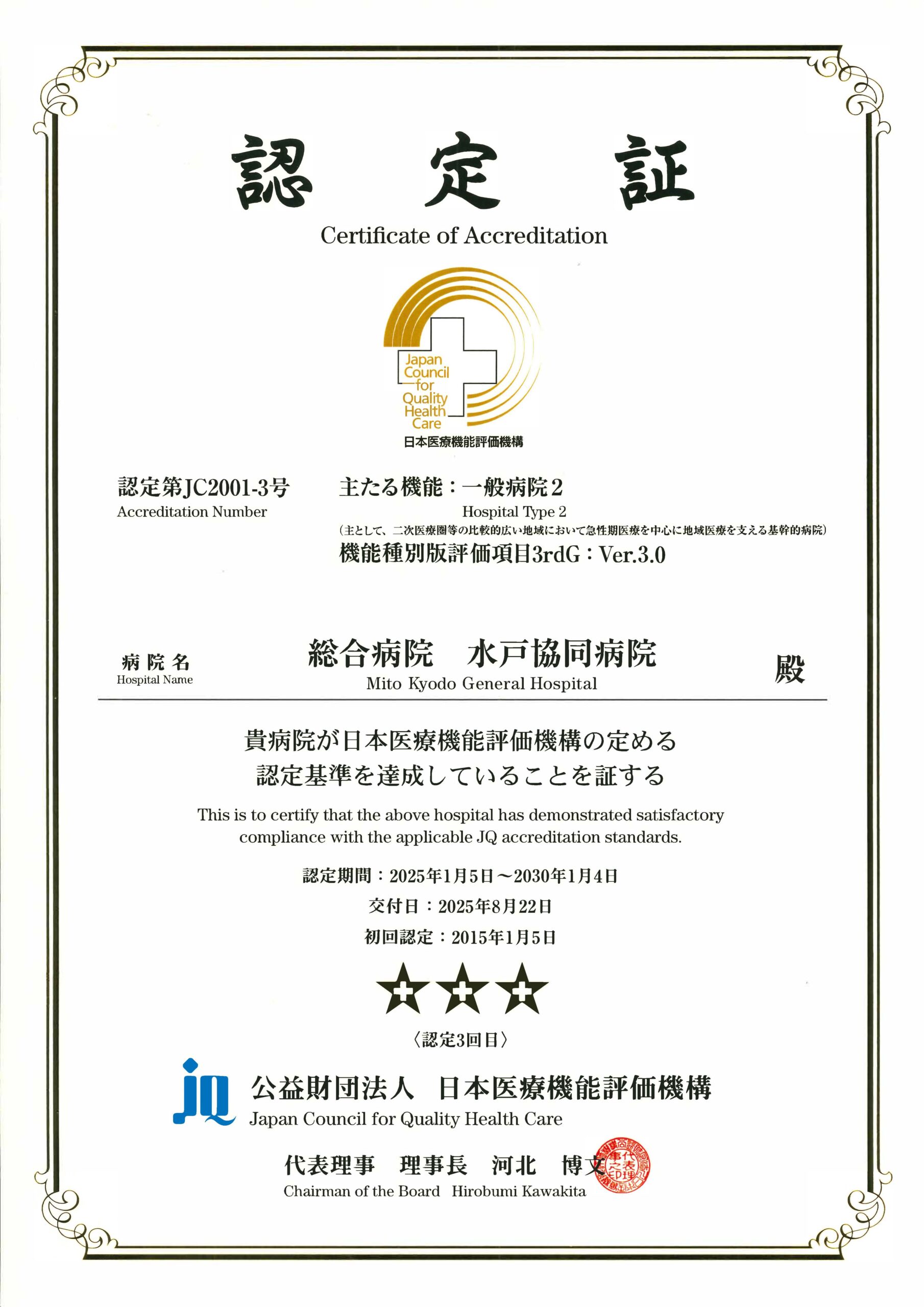 筑波大学附属病院水戸地域医療教育センター総合病院水戸協同病院は、医療の質向上の取り組みとして公益財団法人日本医療機能評価機構の審査を受審し、認定を受けました。