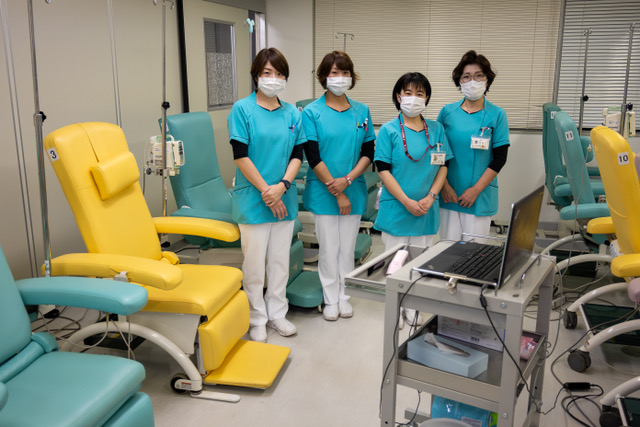 透析室では、年間約30名の血液透析導入患者様がいます。ベッド数は29床で、月・水・金が2部、火・木・土は1部で行なっていますが、入院患者様や他施設からの紹介患者様も受け入れています。医師3名、看護師7名、ME13名、医事課1名のスタッフ全員が連携し、患者様が安全に透析治療を受けられるように努め、笑顔を大切に、心のこもった看護を提供させて頂いています。
